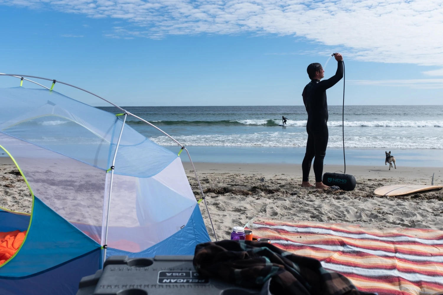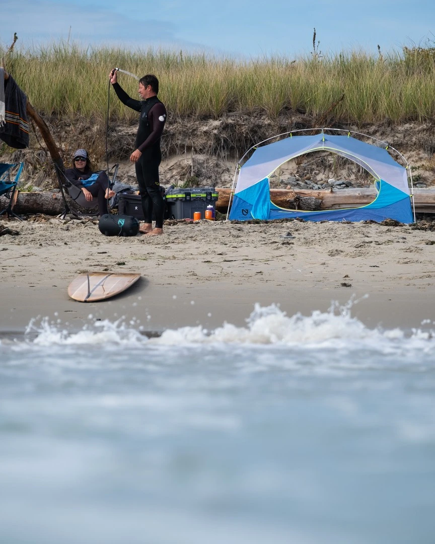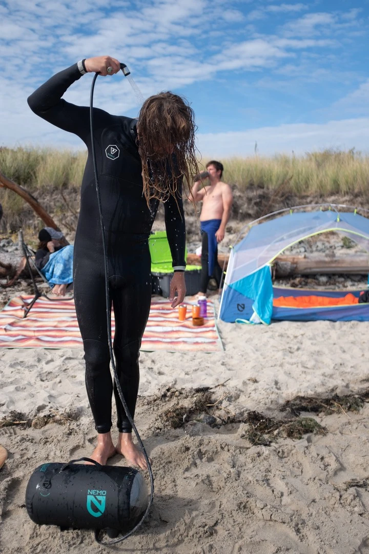 L’Helio Pressure Shower de Nemo est une douche portative dotée d’un réservoir de 11 litres. Contrairement aux douches qui se suspendent, l’Helio tient sur ses pieds, à l’horizontale, car elle est équipée d’un dispositif qui met l’eau sous pression. Le principe est simple : après avoir rempli le réservoir en eau, il suffit d’actionner plusieurs fois la pompe à pied afin que le réservoir monte en pression. Ensuite, il suffit d’actionner le pommeau de douche. On obtient alors un jet qui offre entre 5 à 7 minutes d’eau ayant un flux constant.