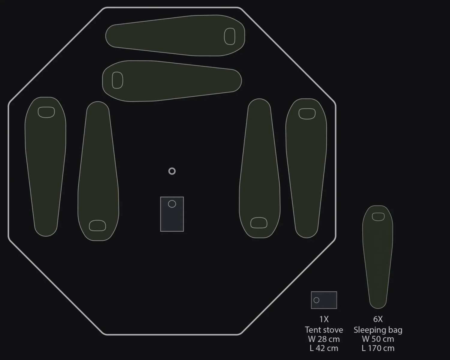 Il s’agit d’un système complet, prêt à l’emploi comprenant : la toile de tente, un mât central, 8 poteaux d’angle et 8 piquets. Le tapis de sol et le poêle à bois montré sur les photos sont vendus séparément.