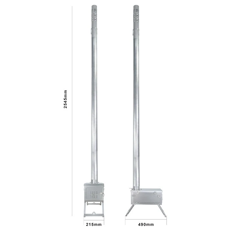 Ses tubes rigides lui assurent une meilleure stabilité et permet d’atteindre une hauteur totale de 255 centimètres à la sortie du conduit de cheminé. La partie sommitale est équipée d’un pare-étincelles pour éviter la projection de braise à l’extérieur. Il est conseiller d’haubaner le conduit (haubans non fournis) au niveau du pare-étincelles lorsqu’il y a du vent. Deux grands piquets en titane de 30 centimètres permettent de stabiliser le poêle au sol.
